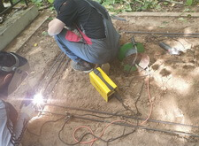 Первым этапом работ будет создание добротного фундамента. Для этого мы вкручиваем четыре металлические сваи, к которым привариваем арматурный каркас.
