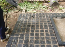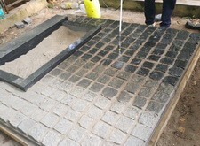 Засыпаем брусчатку пескобетоном, снимаем лишний слой, замываем.